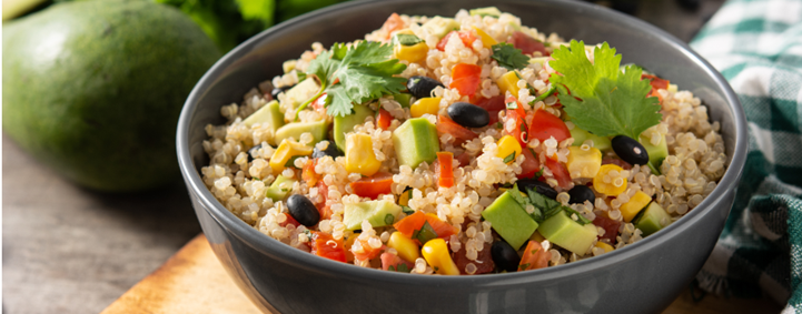 For a hardy Mexican dish take quinoa cooked in vegetable broth and add black beans, corn, fire roasted diced tomatoes, minced garlic, minced jalapeno, olive oil, chili powder, cumin, salt, pepper, and lime juice. Then serve topped with cilantro and cubes of avocado.