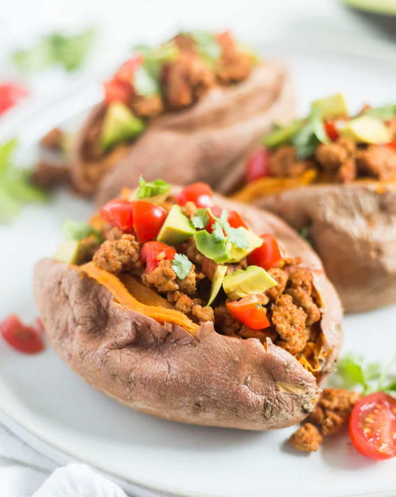 3. When sweet potatoes are done, remove from oven and make a slit in the top of each sweet potato, being careful not to burn yourself. Add about ½ cup ground turkey inside each sweet potato. Top with diced tomatoes, avocado, cilantro or salsa if desired.
